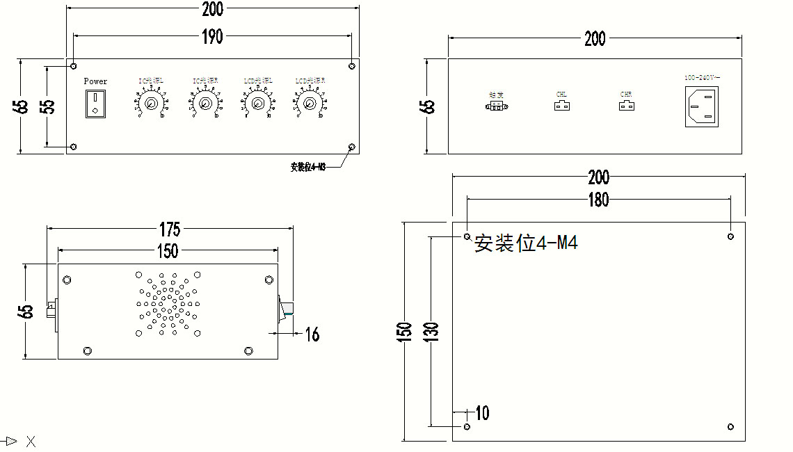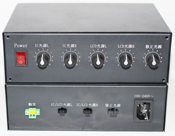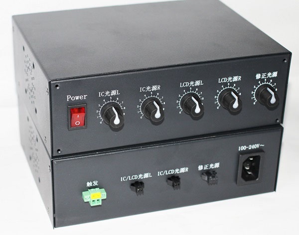 在两路两级切换的基础上再单独增加1路“修正光源”输出5V/30mA。宽电压触发3V-24V,可通过PLC或者其它触发来切换。不触发时“CHL”和“CHR”分别输出“IC光源L”和“IC光源R”所调节的亮度;触发时则“CHL”和“CHR”分别输出“LCD光源L”和“LCD光源R”所调节的亮度。“修正光源”是另外单独调节的无需触发。输入电压AC100V-240V,输出电压默认5V,最大输出电流默认30mA(具体可由客人自定,下单时注明所需电压和功率,总功率默认不超过50W,功率大的需要定制)。安装尺寸190*55mm,外形尺寸200*150*65mm,输出接口“CHL”和“CHR”为2pin SM端子;“修正光源”为3pin SM端子。