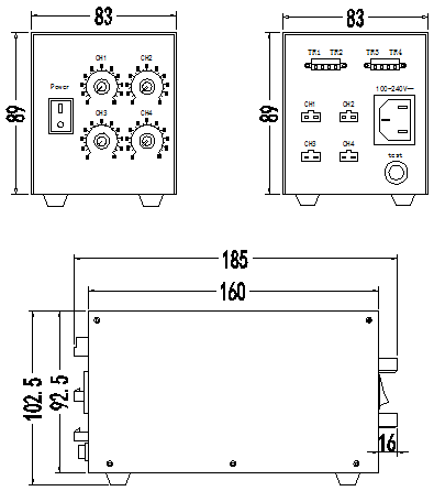 输出四路,模拟手动调节。带外触发功能,可通过PLC或者其它来控制光源的开/关,宽电压触发3V-48V。当按下test按钮时为常亮状态,此时可调节光源亮度至所需等级;当再按一下弹起test按钮时光源灭,该状态下需通过外触发信号来控制点亮光源,点亮时间为PLC或者其它触发电压形成回路的持续时间长短来决定,触发电压回路断开则光源灭;注:外触发控制时会有时间延时,延时时间≤12us。输入电压AC100V-240V,输出电压5V、12V、24V可选,最大输出电流可自由选择(由客户自定,下单时注明所需电压和功率,总功率默认不超过50W,功率更大的需要定制)。功率在30W以上时会加散热风扇。无安装孔位带脚垫,需要锁螺丝安装的提前通知,可配安装支架。外形尺寸160*83*92mm,底部安装尺寸120*54mm,输出接口2pin SM端子。