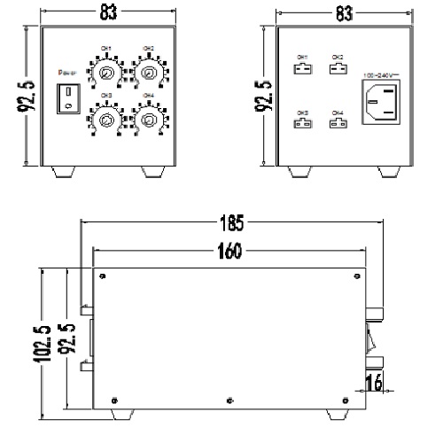 输出四路,模拟手动调节。输入电压AC100V-240V,输出电压5V、12V、24V可选,最大输出电流可自由选择(由客户自定,下单时注明所需电压和功率,总功率默认不超过50W,功率更大的需要定制)。功率在30W以上时会加散热风扇。无安装孔位带脚垫,需要锁螺丝安装的提前通知,可配安装支架。外形尺寸160*83*92mm,底部安装尺寸120*54mm,输出接口2pin SM端子。