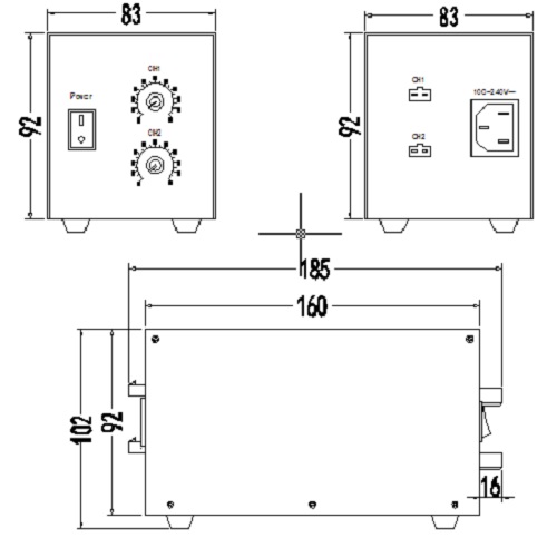 输出两路,模拟手动调节。输入电压AC100V-240V,输出电压5V、12V、24V可选,最大输出电流可自由选择(由客户自定,下单时注明所需电压和功率,总功率默认不超过50W,功率更大的需要定制)。功率在30W以上时会加散热风扇。无安装孔位带脚垫,需要锁螺丝安装的提前通知,可配安装支架。外形尺寸160*83*92mm,底部安装尺寸120*54mm,输出接口2pin SM端子。